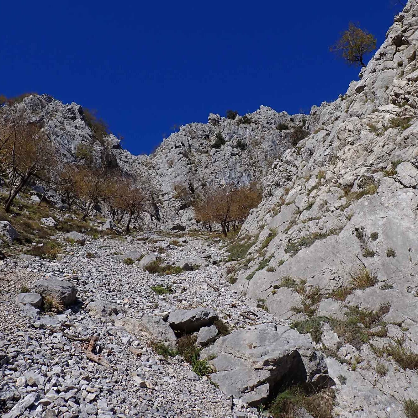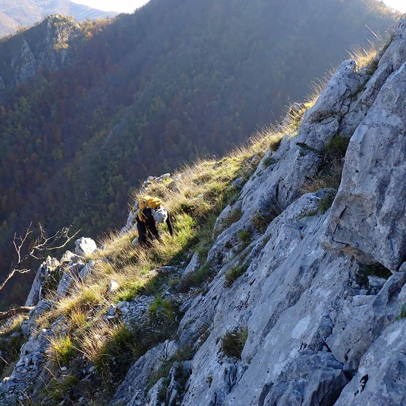 La discesa alla Sella del Romitorio (h 0.15/4.25) può avvenire sia per la via della Scalaccia (it. F35, ripida, I+) sia per la via della Piastra (it. F36), attrezzata ma poco evidente all’inizio; dalla Sella, il percorso più ovvio per tornare a Lucchio passa dalle Calcinaie – a cui si giunge con una sensibile risalita – svolgendosi tutto su sentieri CAI (it. F23 e F6; h 1.20/5.45); in alternativa si potrebbe seguire la ‘strada’ della Faggeta e del Romitorio (it. F25), tragitto molto più breve e senza contropendenze significative, ma poco battuto e con possibili problemi di orientamento.