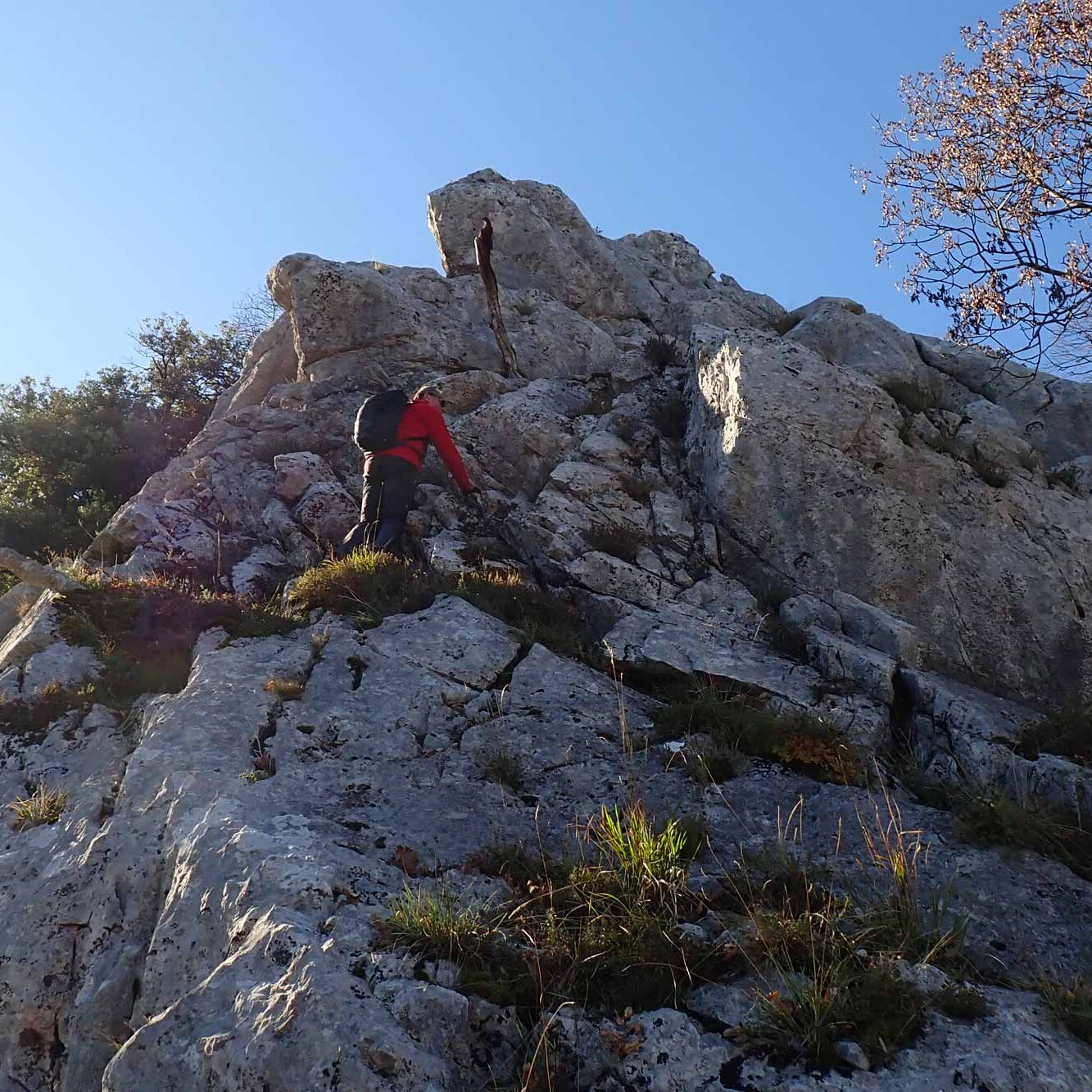 L’ovvio proseguimento della gita sarà fino al Memoriante lungo il tratto finale della cresta Nord o di Vallemagna. Quanto all’accesso, che in ogni caso, in assenza di sentieri, dovrà essere effettuato al meglio, anziché quello dal sottostante sent. 386 si preferisce descrivere quello dall’alto, cioè dalla Sella del Romitorio, perché esso permette di traversare alla base tutto il versante Est del Memoriante, in ambiente facile (benché scomodo) e suggestivo. Alla Sella del Romitorio conviene arrivare da Lucchio percorrendo la bella parte rocciosa della cresta Nord della Penna di Lucchio e traversando poi a destra con l’it. F27 del libro prima della parte finale boscosa della cresta, meno interessante: in questo modo si evita il più lungo giro attraverso l’anticima Nord della Penna di Lucchio.
