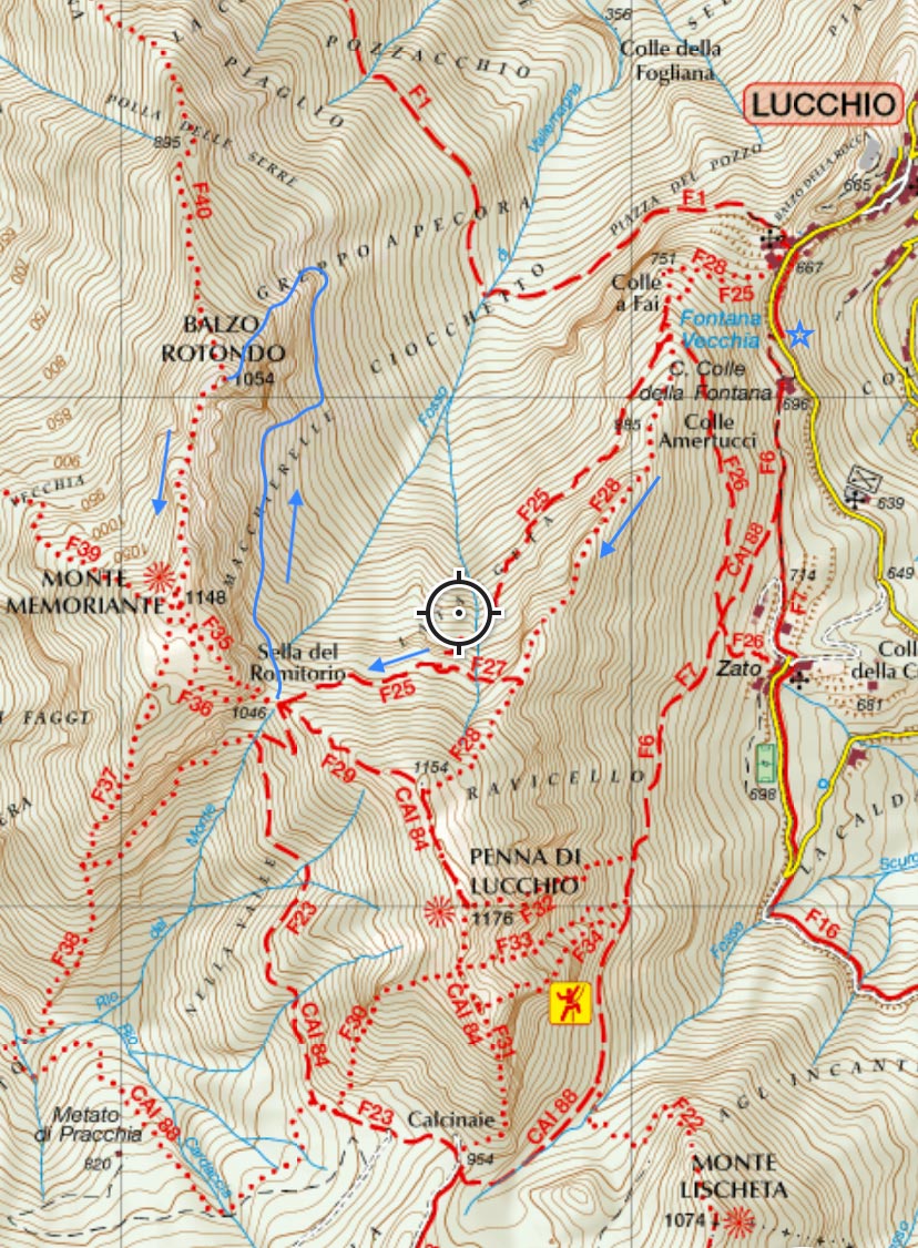 Si parte dal parcheggio di Lucchio alto (662 m) e, come descritto all’it. F28 del libro, si sale la facile cresta N della Penna di Lucchio fino alla sella a 1017 m (h 1.10); qui si abbandona la cresta e si segue verso destra un tracciato nel bosco a andamento orizzontale (it. F27 del libro) che termina alla Sella del Romitorio tra Penna di Lucchio e Memoriante (1046 m, h 0.15/1.25).