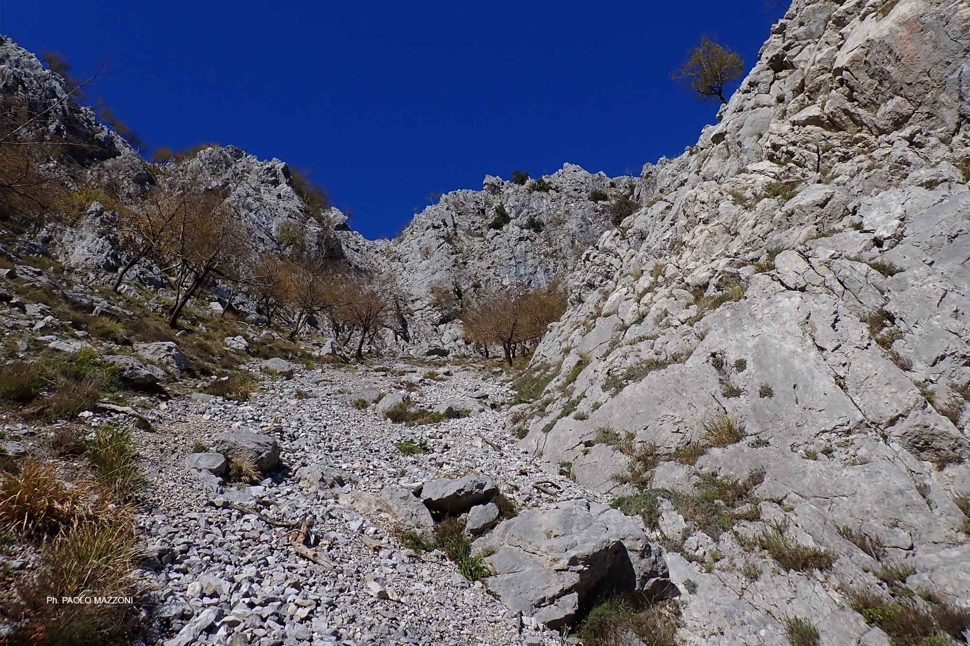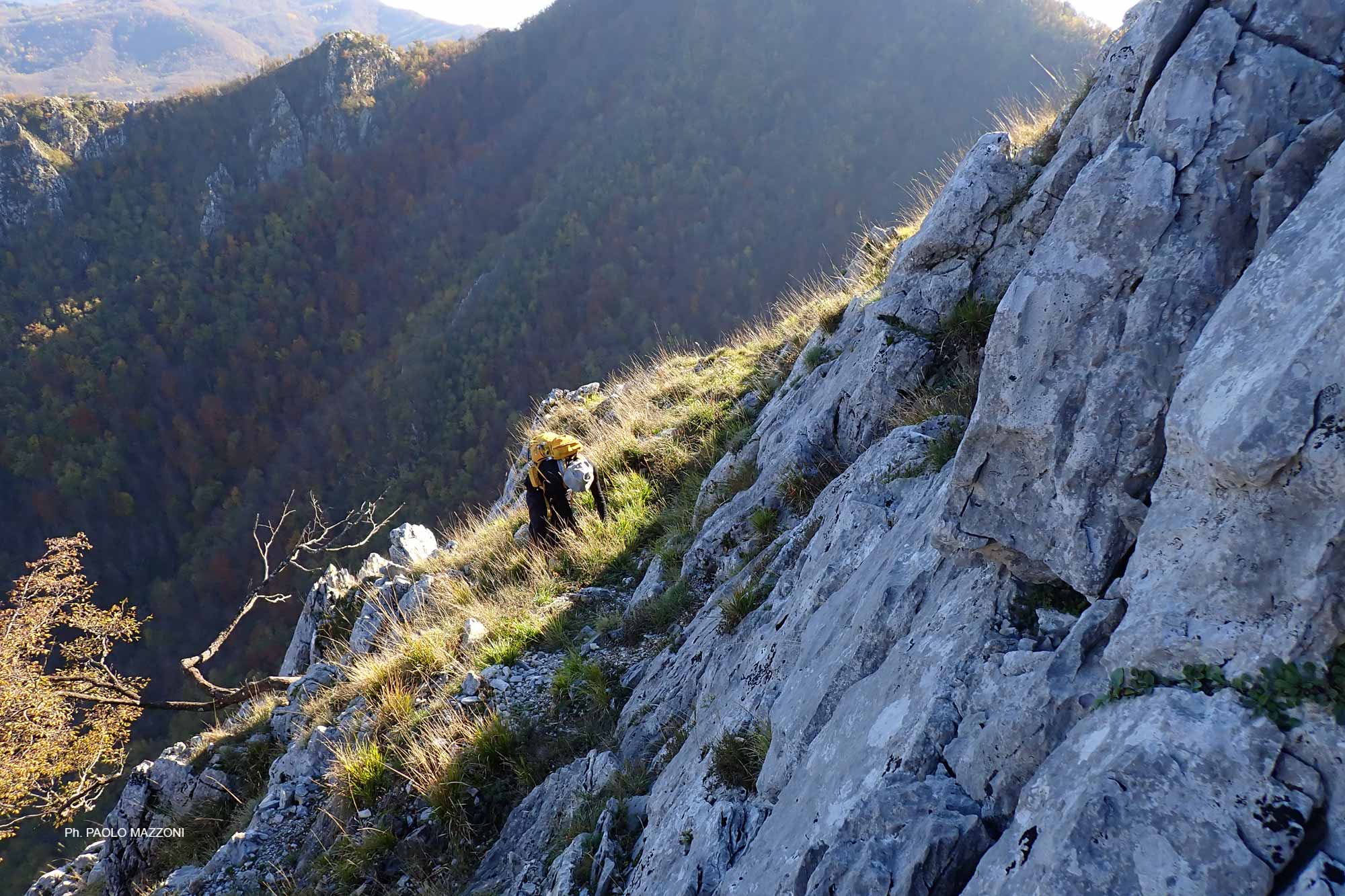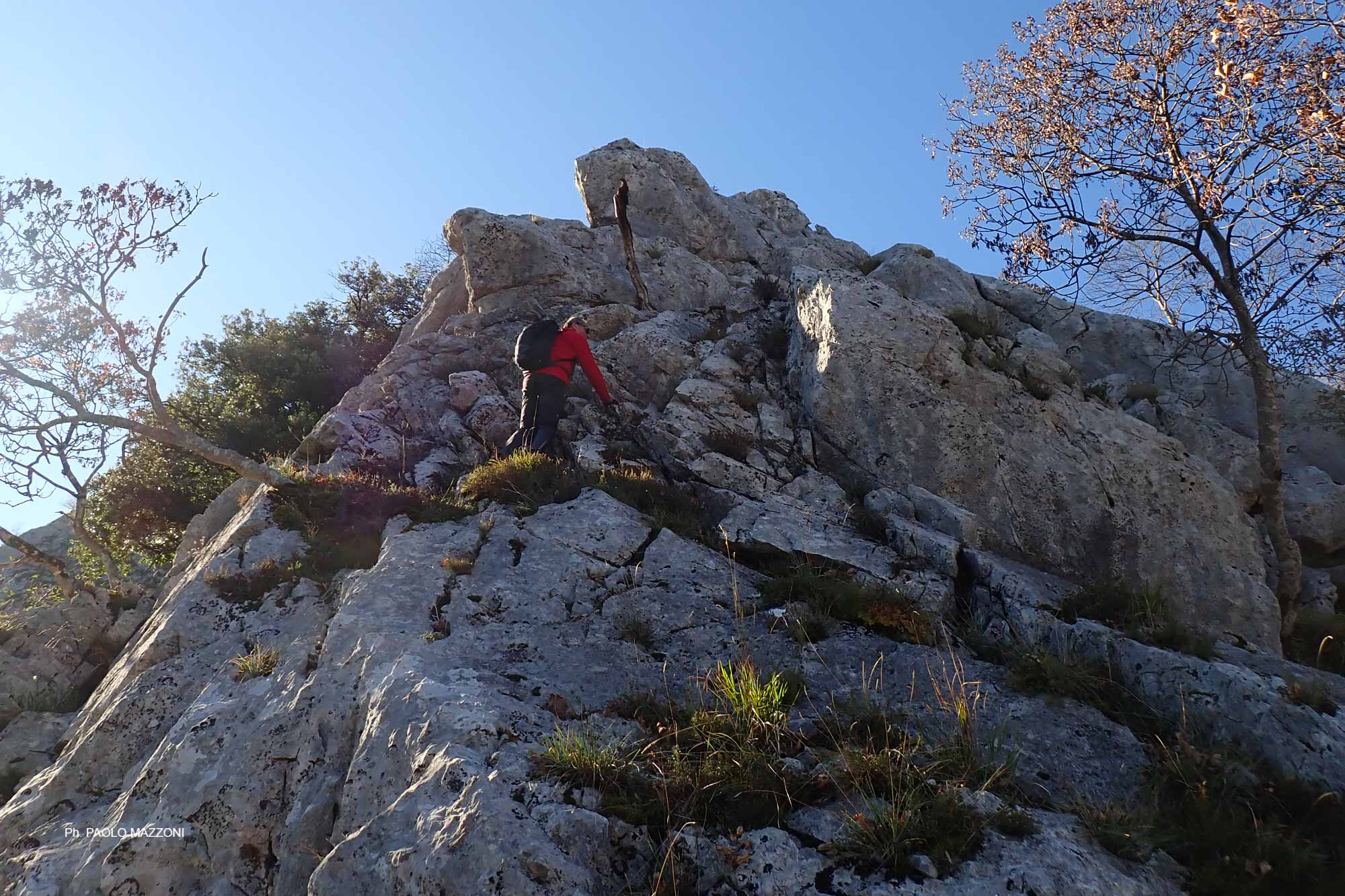 La discesa alla Sella del Romitorio (h 0.15/4.25) può avvenire sia per la via della Scalaccia (it. F35, ripida, I+) sia per la via della Piastra (it. F36), attrezzata ma poco evidente all’inizio; dalla Sella, il percorso più ovvio per tornare a Lucchio passa dalle Calcinaie – a cui si giunge con una sensibile risalita – svolgendosi tutto su sentieri CAI (it. F23 e F6; h 1.20/5.45); in alternativa si potrebbe seguire la ‘strada’ della Faggeta e del Romitorio (it. F25), tragitto molto più breve e senza contropendenze significative, ma poco battuto e con possibili problemi di orientamento.