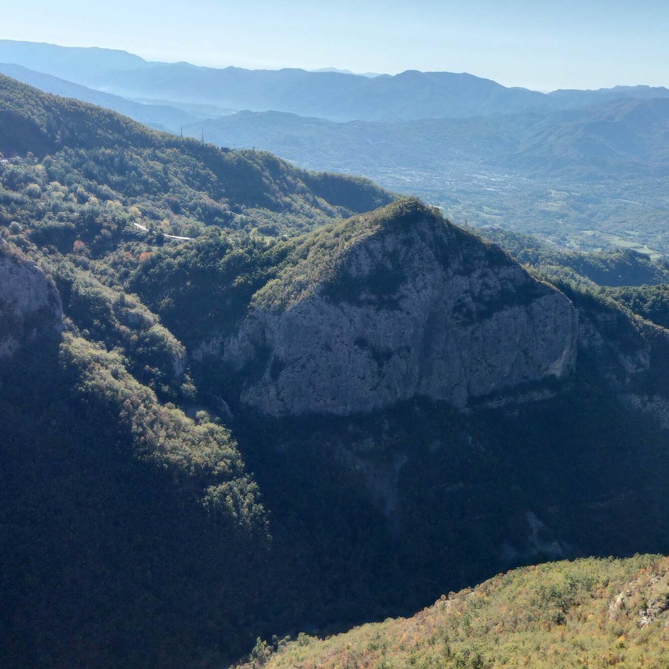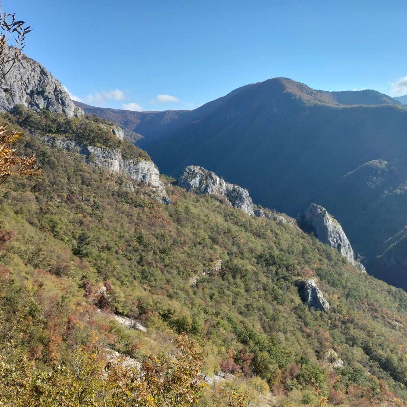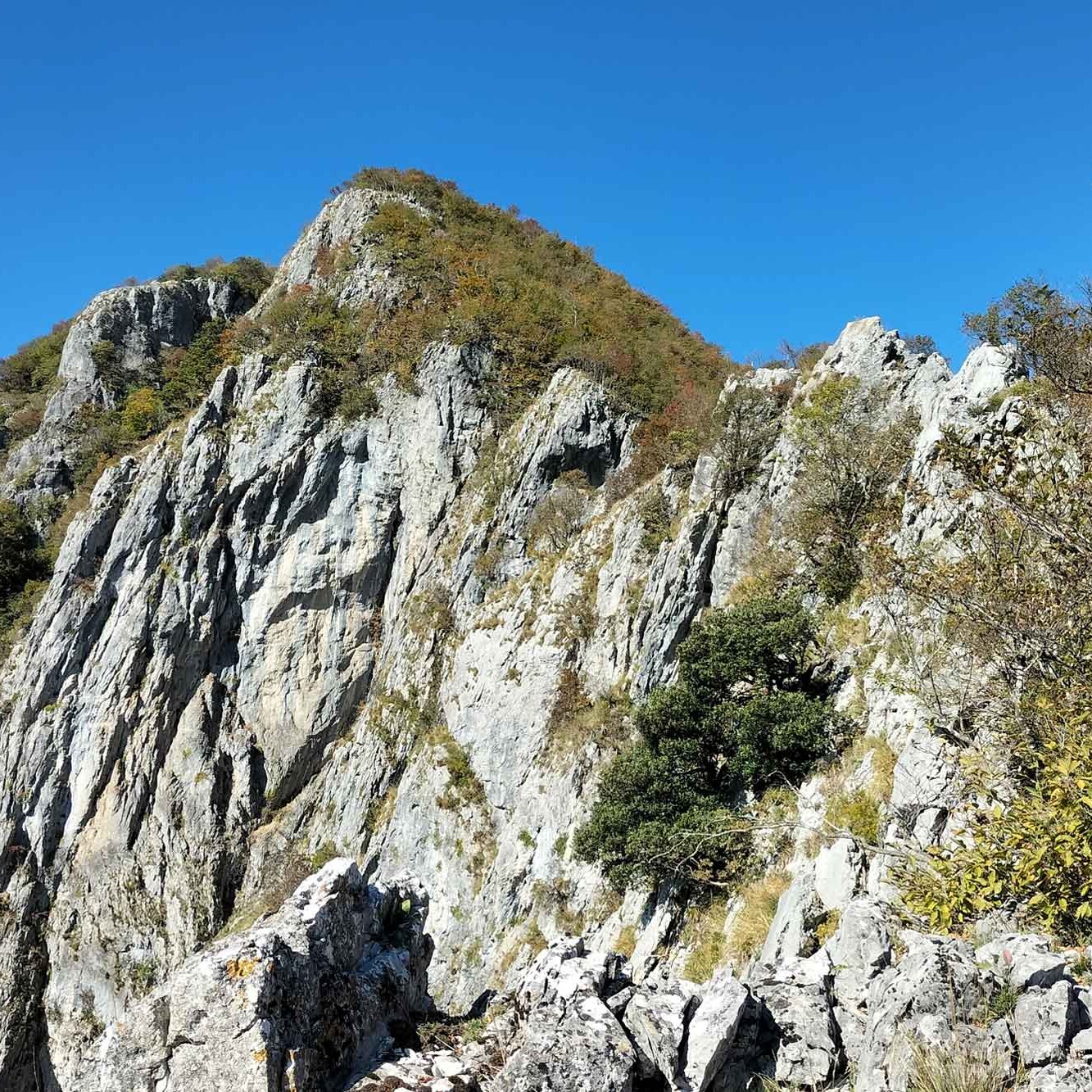 Tornati alla sella (h 0.30/1.30), si segue verso l’alto agevolmente la dorsale, qui larga e mista di rocce sparse, paretine e rada faggeta; si procede senza fatica e piacevolmente grazie a tracce varie ed evidenti. Più su il filo si definisce meglio, ma un primo tratto è interdetto da un salto liscio e verticale che sbarra il passo; ci si tiene pertanto a destra ai piedi delle rocce finché non è possibile riguadagnare il filo a una sella. Di fronte si alza ora un torrione massiccio e ripido; si va a salire frontalmente una specie di spigolo di un paio di metri, verticale ma solido (II+); dopo un delicato traverso verso destra si sale a sinistra una bassa paretina anch’essa verticale, ma con solide liste e maniglie (II+); al di sopra, fino alla cima del torrione e oltre, il terreno diventa più facile, ma a sinistra precipitano sul Vallone delle Grottacce alte pareti verticali, e l’esposizione spesso è notevole; a destra il terreno è assai meno ripido e perlopiù boscoso, ma non dovunque sarebbe possibile raccordarsi facilmente con le tracce che, a distanza maggiore o minore dal filo, salgono parallele alla cresta. Una placca liscia e stretta deve essere salita (se non si preferisce aggirarla cautamente, e per non breve tratto, a destra) con la massima attenzione perché l’esposizione è fortissima; appena oltre il filo ritorna facile ma ancora aereo fino a un masso caratteristico, oltre il quale si prosegue in breve fino a una sella sopra la quale il terreno cambia aspetto: ora la cresta continua a salire anche più ripida e comunque sempre gradevolmente rocciosa, ma senza discontinuità con il terreno boscoso alla sua destra, che pertanto è sempre accessibile e percorribile, se lo si preferisce, in alternativa al filo, sul quale si segnalano alcuni pulpiti aerei e spettacolari.