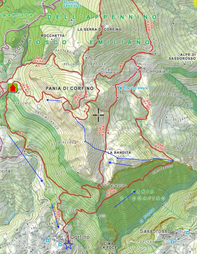N.B. – Seguendo il sent. 58 a sinistra si può tornare velocemente a Corfino; seguendolo a destra fino alle case di Campaiana (1352 m; è il vecchio alpeggio di Corfino) si raggiungerebbe di nuovo il sent. 56, con il quale si tornerebbe alla sella d’inizio della Cresta delle Grottacce e, ripercorrendo da lì i propri passi, a Corfino.