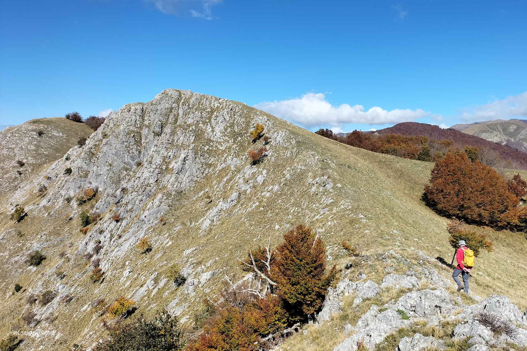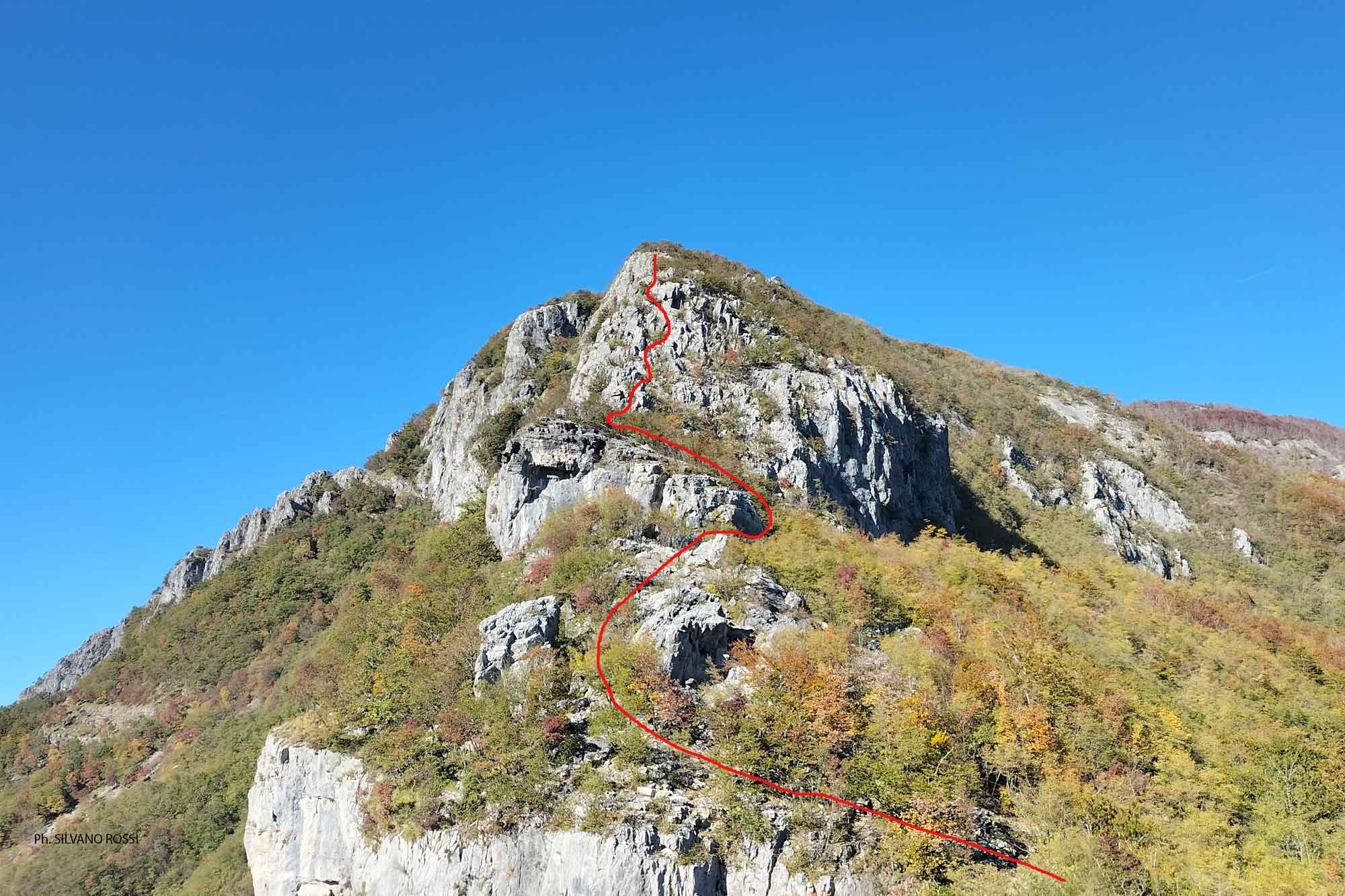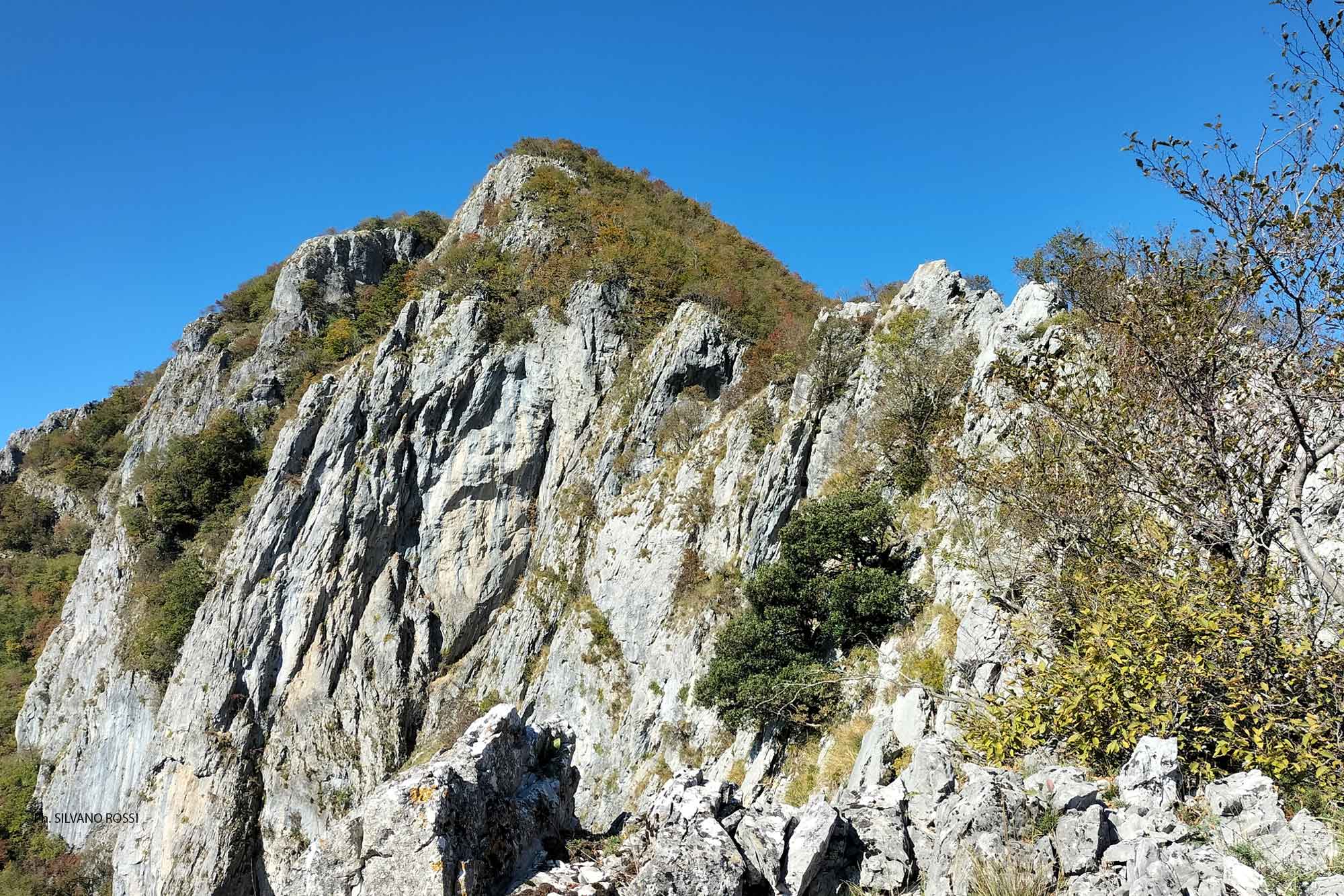 Tornati alla sella (h 0.30/1.30), si segue verso l’alto agevolmente la dorsale, qui larga e mista di rocce sparse, paretine e rada faggeta; si procede senza fatica e piacevolmente grazie a tracce varie ed evidenti. Più su il filo si definisce meglio, ma un primo tratto è interdetto da un salto liscio e verticale che sbarra il passo; ci si tiene pertanto a destra ai piedi delle rocce finché non è possibile riguadagnare il filo a una sella. Di fronte si alza ora un torrione massiccio e ripido; si va a salire frontalmente una specie di spigolo di un paio di metri, verticale ma solido (II+); dopo un delicato traverso verso destra si sale a sinistra una bassa paretina anch’essa verticale, ma con solide liste e maniglie (II+); al di sopra, fino alla cima del torrione e oltre, il terreno diventa più facile, ma a sinistra precipitano sul Vallone delle Grottacce alte pareti verticali, e l’esposizione spesso è notevole; a destra il terreno è assai meno ripido e perlopiù boscoso, ma non dovunque sarebbe possibile raccordarsi facilmente con le tracce che, a distanza maggiore o minore dal filo, salgono parallele alla cresta. Una placca liscia e stretta deve essere salita (se non si preferisce aggirarla cautamente, e per non breve tratto, a destra) con la massima attenzione perché l’esposizione è fortissima; appena oltre il filo ritorna facile ma ancora aereo fino a un masso caratteristico, oltre il quale si prosegue in breve fino a una sella sopra la quale il terreno cambia aspetto: ora la cresta continua a salire anche più ripida e comunque sempre gradevolmente rocciosa, ma senza discontinuità con il terreno boscoso alla sua destra, che pertanto è sempre accessibile e percorribile, se lo si preferisce, in alternativa al filo, sul quale si segnalano alcuni pulpiti aerei e spettacolari.