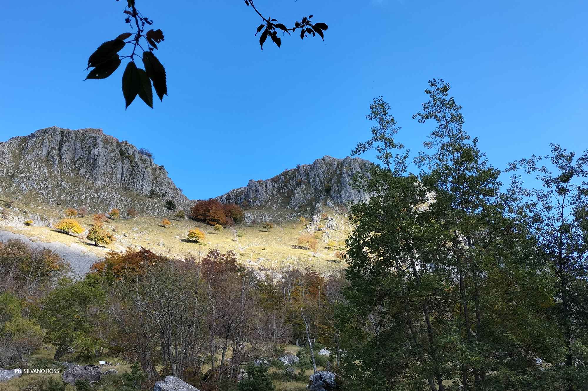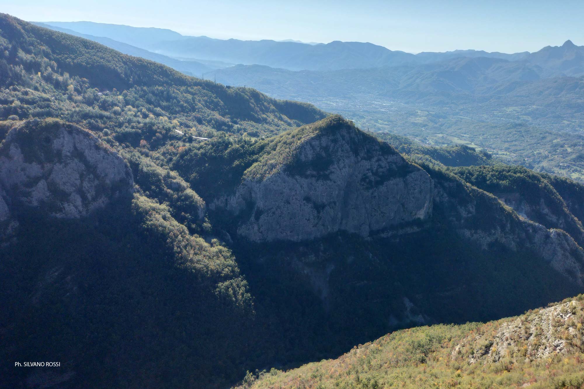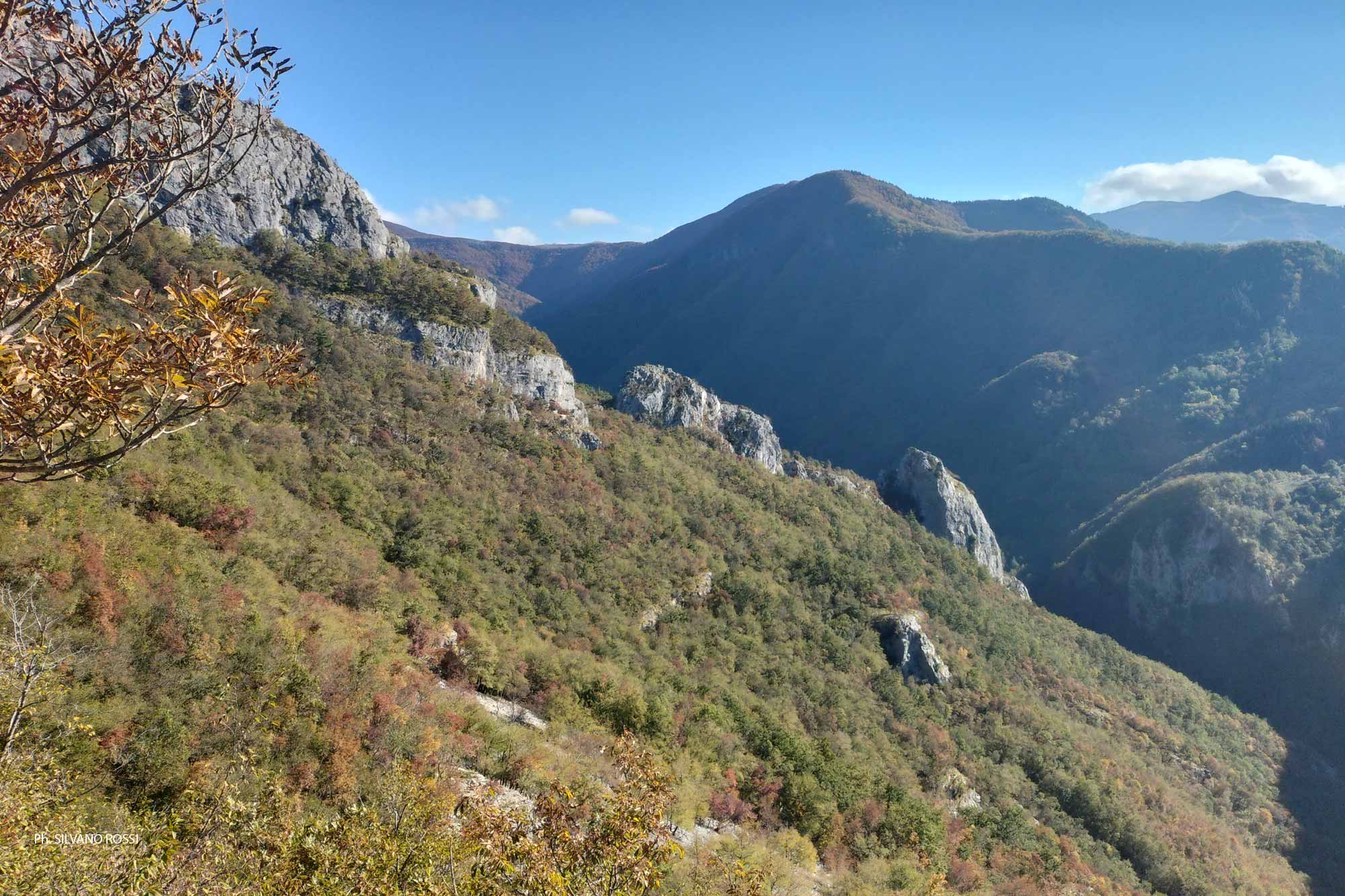 Tornati alla sella (h 0.30/1.30), si segue verso l’alto agevolmente la dorsale, qui larga e mista di rocce sparse, paretine e rada faggeta; si procede senza fatica e piacevolmente grazie a tracce varie ed evidenti. Più su il filo si definisce meglio, ma un primo tratto è interdetto da un salto liscio e verticale che sbarra il passo; ci si tiene pertanto a destra ai piedi delle rocce finché non è possibile riguadagnare il filo a una sella. Di fronte si alza ora un torrione massiccio e ripido; si va a salire frontalmente una specie di spigolo di un paio di metri, verticale ma solido (II+); dopo un delicato traverso verso destra si sale a sinistra una bassa paretina anch’essa verticale, ma con solide liste e maniglie (II+); al di sopra, fino alla cima del torrione e oltre, il terreno diventa più facile, ma a sinistra precipitano sul Vallone delle Grottacce alte pareti verticali, e l’esposizione spesso è notevole; a destra il terreno è assai meno ripido e perlopiù boscoso, ma non dovunque sarebbe possibile raccordarsi facilmente con le tracce che, a distanza maggiore o minore dal filo, salgono parallele alla cresta. Una placca liscia e stretta deve essere salita (se non si preferisce aggirarla cautamente, e per non breve tratto, a destra) con la massima attenzione perché l’esposizione è fortissima; appena oltre il filo ritorna facile ma ancora aereo fino a un masso caratteristico, oltre il quale si prosegue in breve fino a una sella sopra la quale il terreno cambia aspetto: ora la cresta continua a salire anche più ripida e comunque sempre gradevolmente rocciosa, ma senza discontinuità con il terreno boscoso alla sua destra, che pertanto è sempre accessibile e percorribile, se lo si preferisce, in alternativa al filo, sul quale si segnalano alcuni pulpiti aerei e spettacolari.