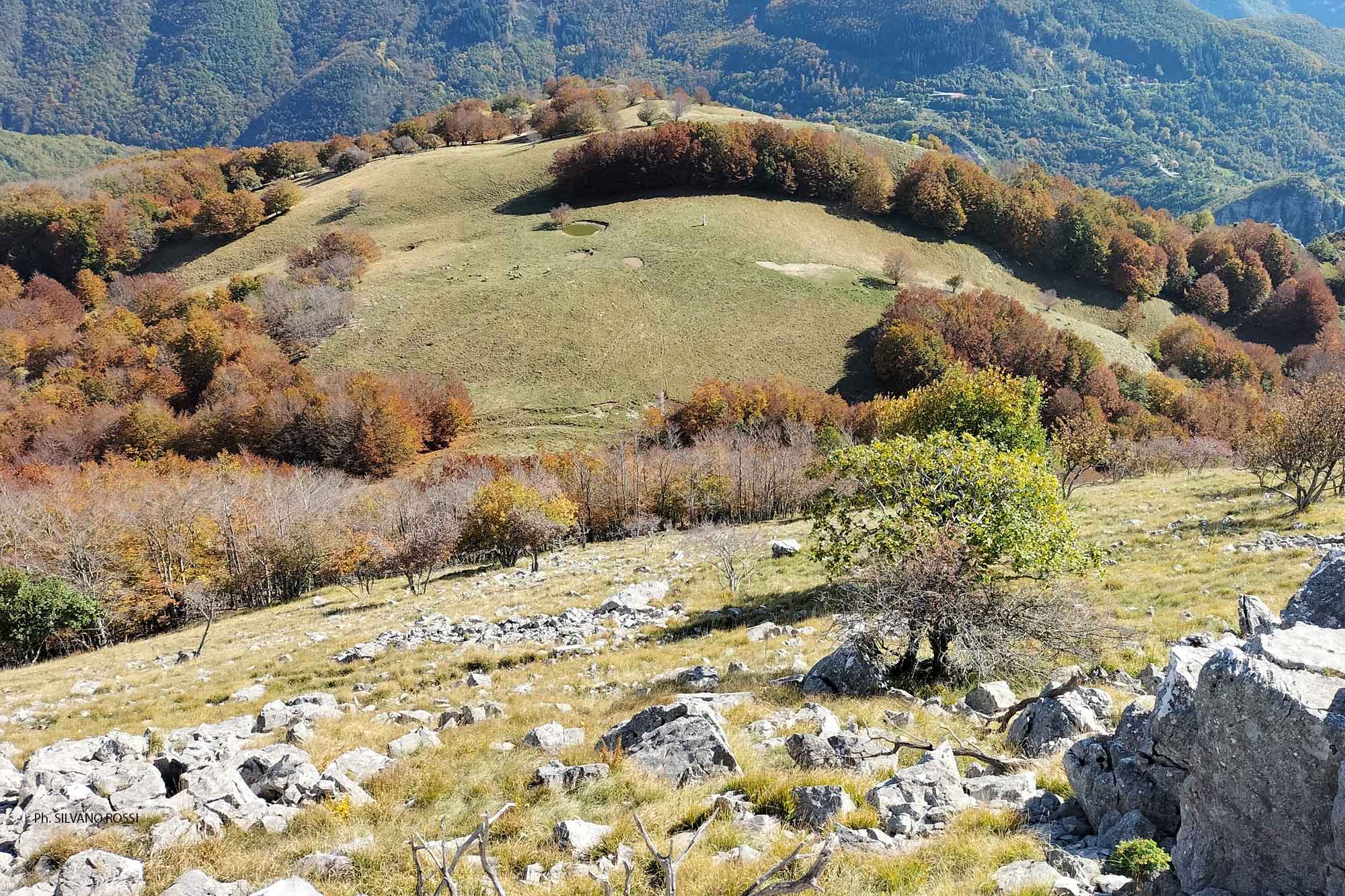 Al termine delle rocce si prosegue su larghi prati in loc. La Bandita fino al punto più alto (1425.6 m, h 1.30/3.00); mantenendo la direzione di provenienza si scende di qualche metro, dopo pochi passi nel bosco, a un altro vasto pianoro con qualche pozza e un monumento, oltre il quale s’incrocia il sent. 58 (1400 m c.).
