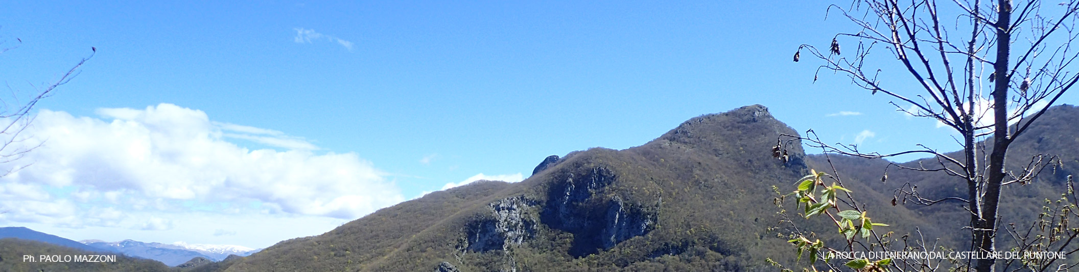 Nel punto in cui il nuovo sentiero raggiunge il filo della dorsale si trova un altro bivio non molto evidente ma segnalato da un ometto e da una freccia rossa su una roccia: a destra un tracciato scende verso il vero Puntone. Nel frattempo, però, si consiglia d’insistere verso N sul sentiero principale, che segue il filo o si tiene poco sotto alla sua destra, fino a una larga sella con rudere in loc. Mandriella e poi alla poco definita vetta del Castellare del Puntone (813.5 m, h 0.15/1.45), punto culminante della dorsale e ottimo belvedere verso la Rocca di Tenerano.