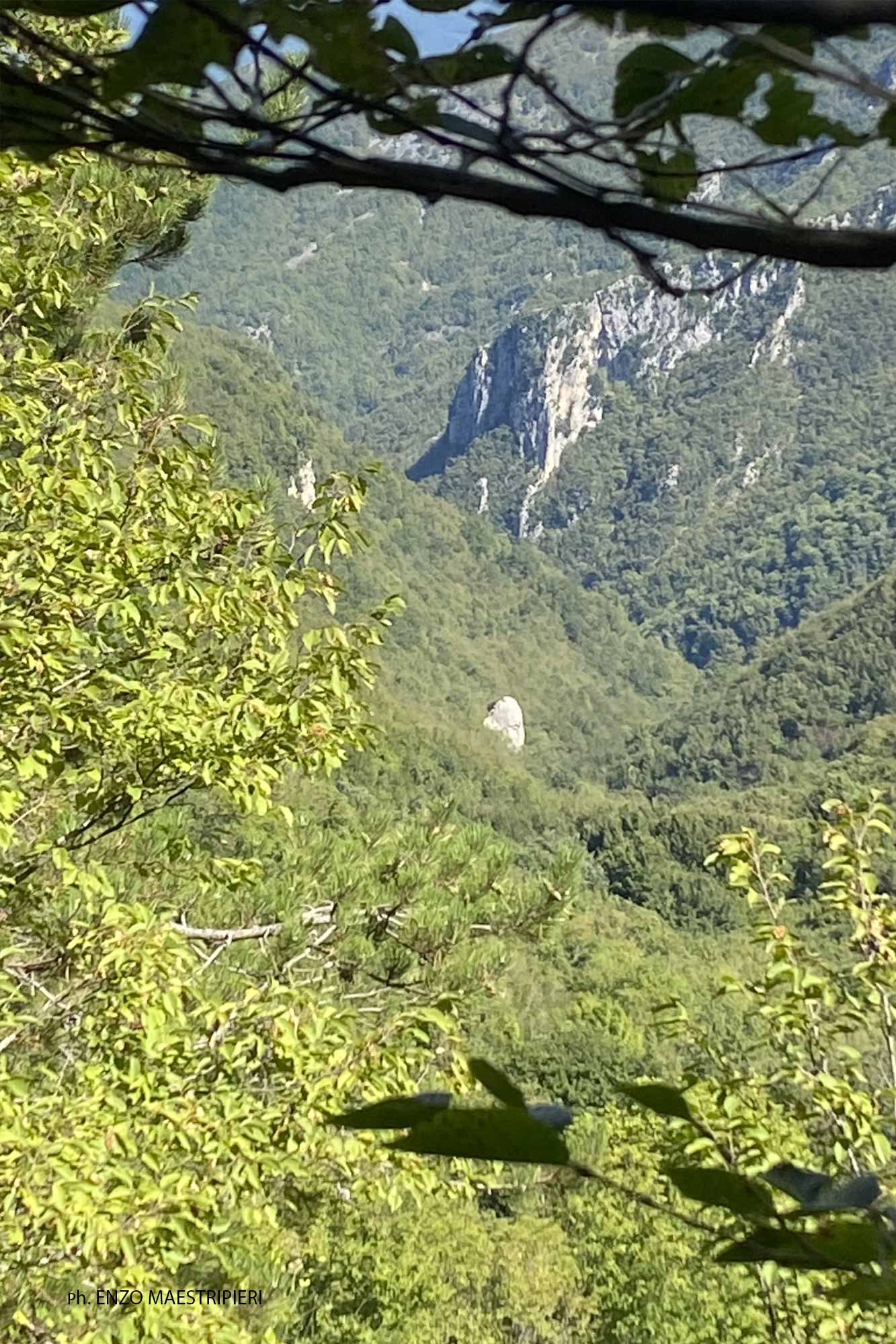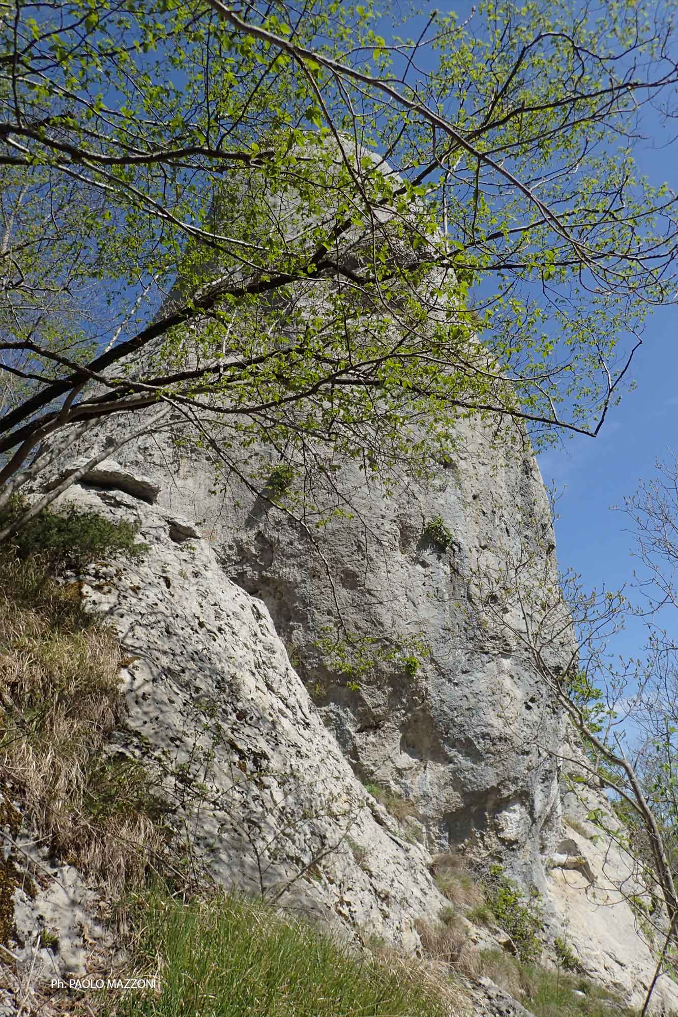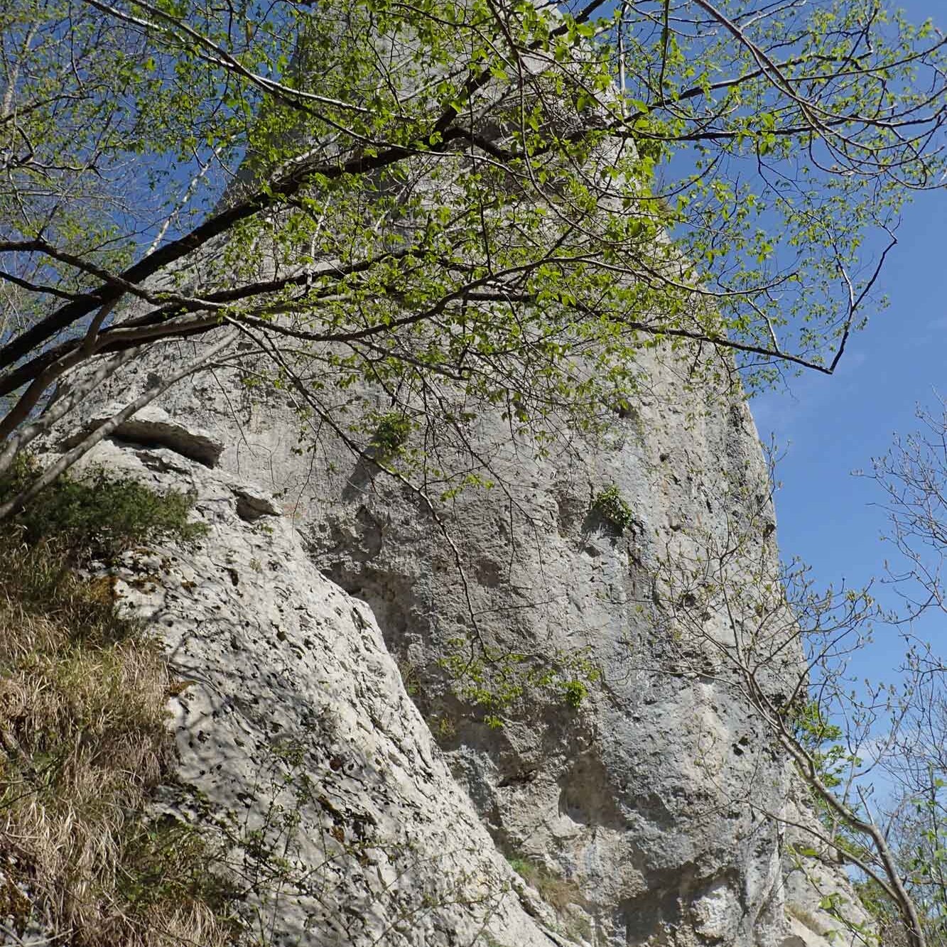 Ritornati sui propri passi, e giunti di nuovo al bivio per il Puntone (h 0.15/2.00), si segue verso sinistra (Val di Prata) un sentiero all’inizio poco evidente che traversa in costa con poca perdita di quota e poi inizia a scendere più decisamente a tornanti: vi si trovano vecchi e nuovi segni rossi e arancioni e molti ometti, da cercare e seguire scrupolosamente finché non si arriva ai piedi dell’inconfondibile Puntone (h 0.15/2.15, 700 m c.): un liscio rilievo conico alto circa 30 m effettivamente somigliante a un dente o a una zanna, sul quale, tra le diverse vie di arrampicata presenti, la più facile sembra essere quella di fronte a chi proviene dall’alto, che percorre fino all’aguzza vetta una specie di costola arrotondata con difficoltà forse di IV; il Puntone fu salito già nel 1963 da Renzo Gemignani. L’eventuale, breve periplo attorno alla sua base certifica all’escursionista l’assenza di vie di salita alla sua portata; preso atto di ciò si continua la gita seguendo qualche vaga traccia orizzontale, oppure al meglio, fino al vicinissimo solco di fondovalle, oltrepassato il quale ci si trova sulle pendici boscose della dorsale in destra idrografica della Val di Prata, il cui filo si trova poco sopra e che bisogna raggiungere. Senza farsi tentare da svianti tracce trasversali, conviene invece salire già subito, e per la massima pendenza o quasi, sul ripido ma facile pendio (pur in assenza di sentieri), guadagnando presto il filo – in parte roccioso -: su di esso oppure poco sotto sul versante di provenienza si trovano evidenti tracce più o meno continue che facilitano il cammino verso l’alto. Incrociate e ignorate un paio di tracce segnate che non servono allo scopo, e visitato sul filo qualche spettacolare pulpito roccioso, si giunge infine a un curioso corridoio tra pareti verticali, la cui sponda sinistra appartiene al Pilastro di Val di Prata: un brevissimo e scosceso sentiero all’ingresso del corridoio consente di salirlo in pochi passi, per forse una ventina di metri di dislivello, fino al punto più alto, angusto, aereo e attrezzato con una catena di sosta (879.3 m, h 1.00/3.15). Tornati al corridoio, lo si percorre – sulle placche a sinistra sono visibili molte vie di arrampicata – e al suo termine si prende a sinistra un sentiero che prima scende qualche metro sotto altre vie di arrampicata, poi traversa a destra, accosta una casetta e infine risale in breve allo sterrato di cava Peghini percorso dal sent. CAI 184 (865.3 m). Se si fosse partiti dalla Gabellaccia lo si seguirebbe verso destra per pochi minuti fino al parcheggio, così concludendo la gita; se invece si è partiti da Maestà di Villa lo si segue lungamente verso sinistra in leggera discesa fino alla quota minima di 770 m c., risalendo poi alla cava Peghini (807.4 m) e ai Prati di Cardeto (1089.7 m, h 1.15/4.30); di lì si continua verso sinistra, definitivamente in discesa, sul sent. 140 (ex 40) e poi 171 fino alla Foce di S. Antonio (863 m) e al parcheggio (h 1.30/6.00).