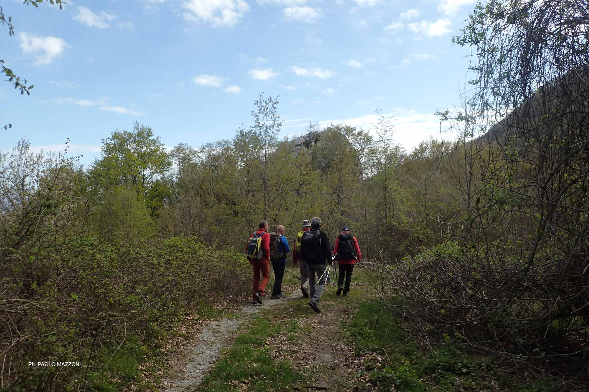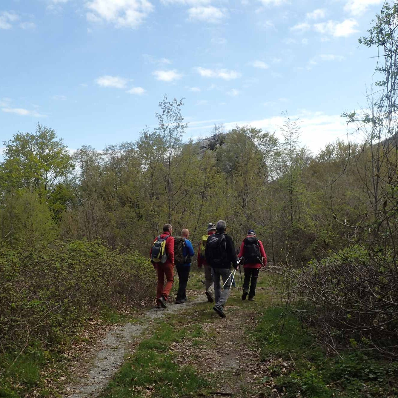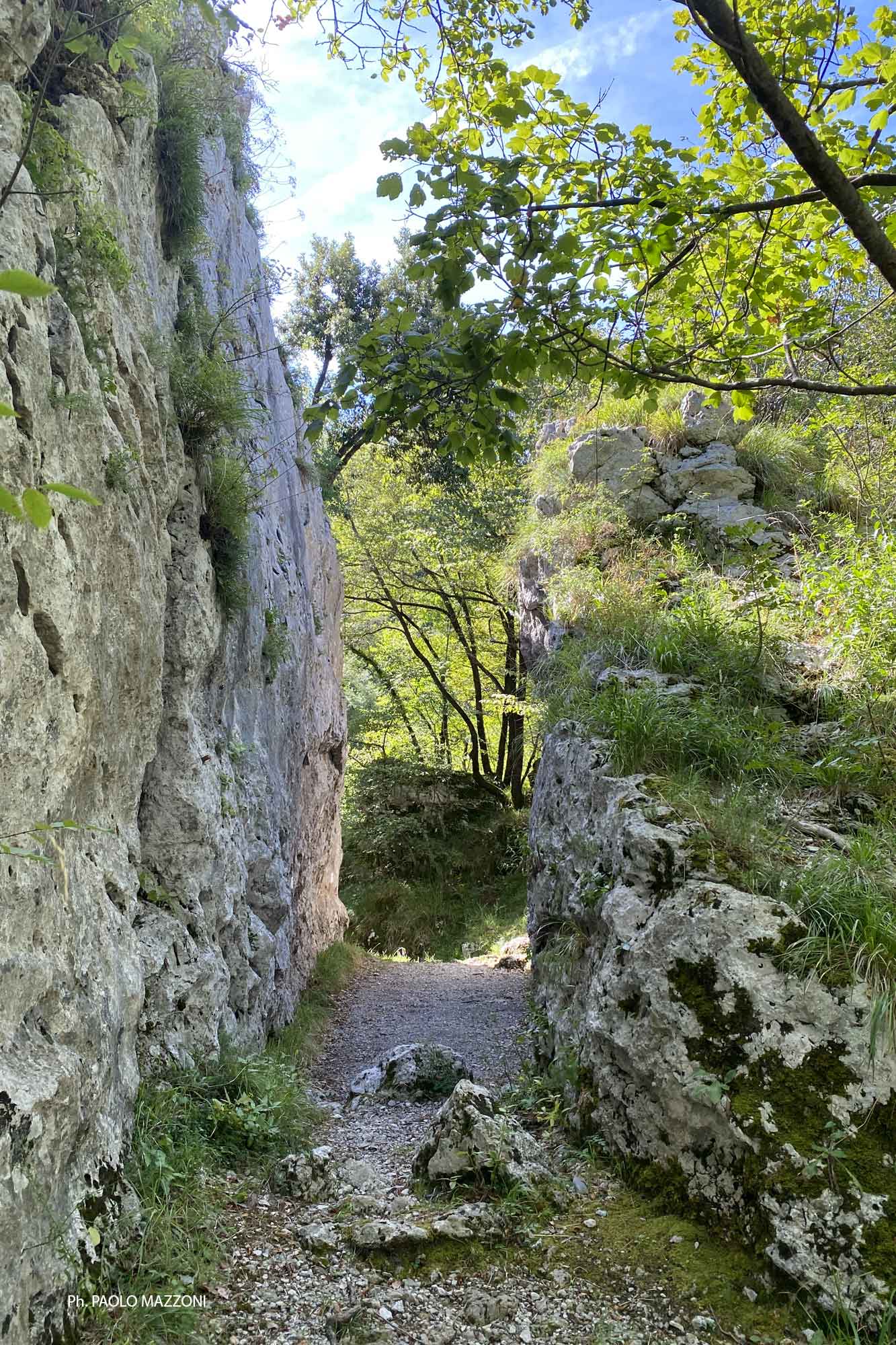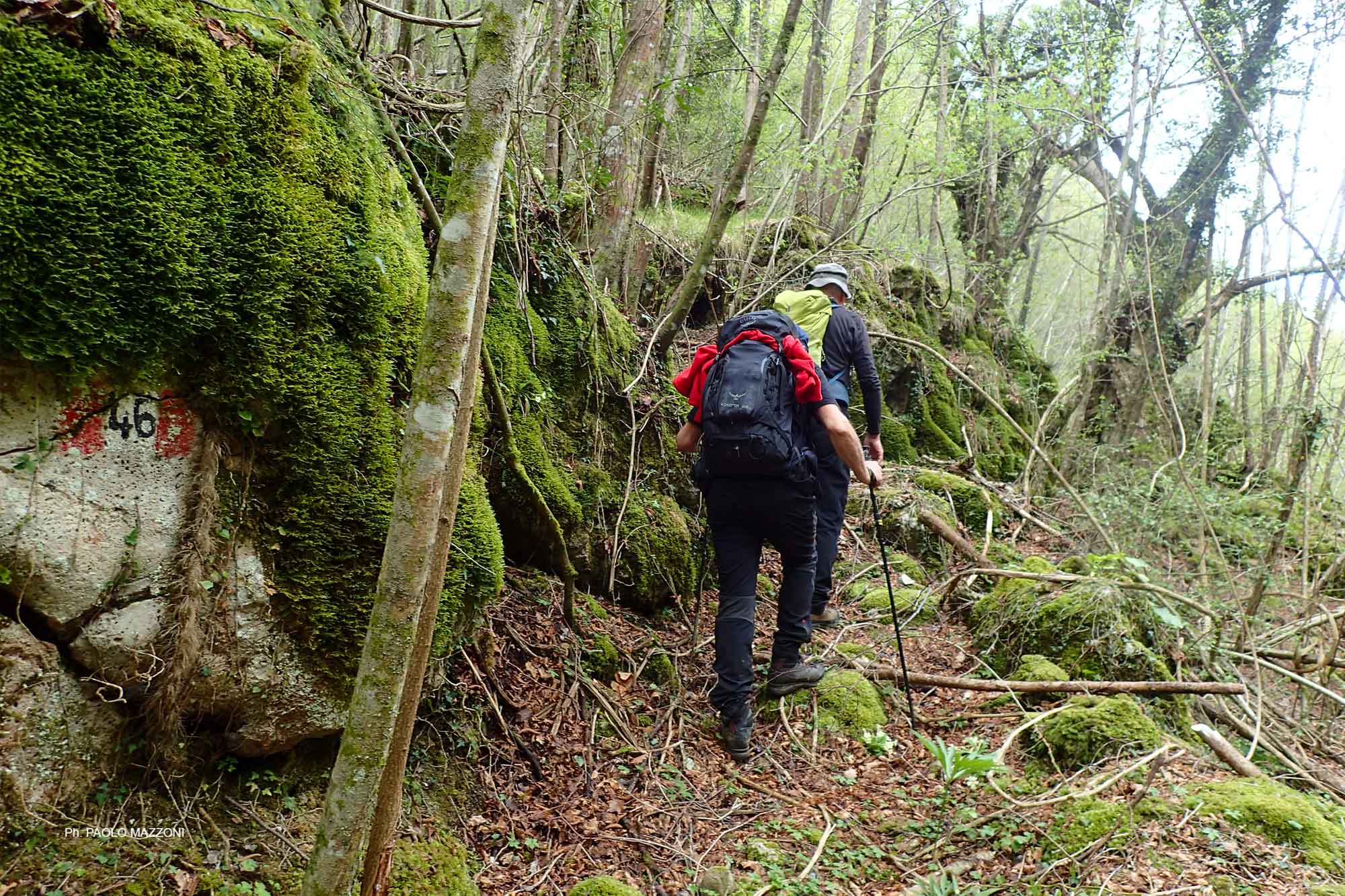 All’inizio si segue il tracciato comune ai sentieri CAI 197 (ex 46) e 171; poco dopo si lascia a sinistra il 171, lungo il quale si tornerà, e si continua sul 197, prima più o meno in orizzontale e poi scendendo sensibilmente; lasciato a sinistra un sentiero per la Tecchia di Tenerano, segnalato da un cartello, si va ad attraversare a 360 m c. la Val Saliceto. Al di là il sentiero inizia a salire lungamente e regolarmente nel bosco, avendo a sinistra la dorsale secondaria che dai pressi della Gabellaccia si dirige a N formando la quota 813.5 m, chiamata M. Puntone dalla CTR ma più propriamente Castellare del Puntone dalla guida CAI-TCI. Infine il 197 avvicina il filo di tale dorsale, tra il Castellare e la Gabellaccia, e giunge a un bivio (770 m c., h 1.30): qui lo si lascia per prendere a sinistra un altro sentiero (con indicazione ‘P’ su un albero) che guadagna subito il filo pianeggiante.
