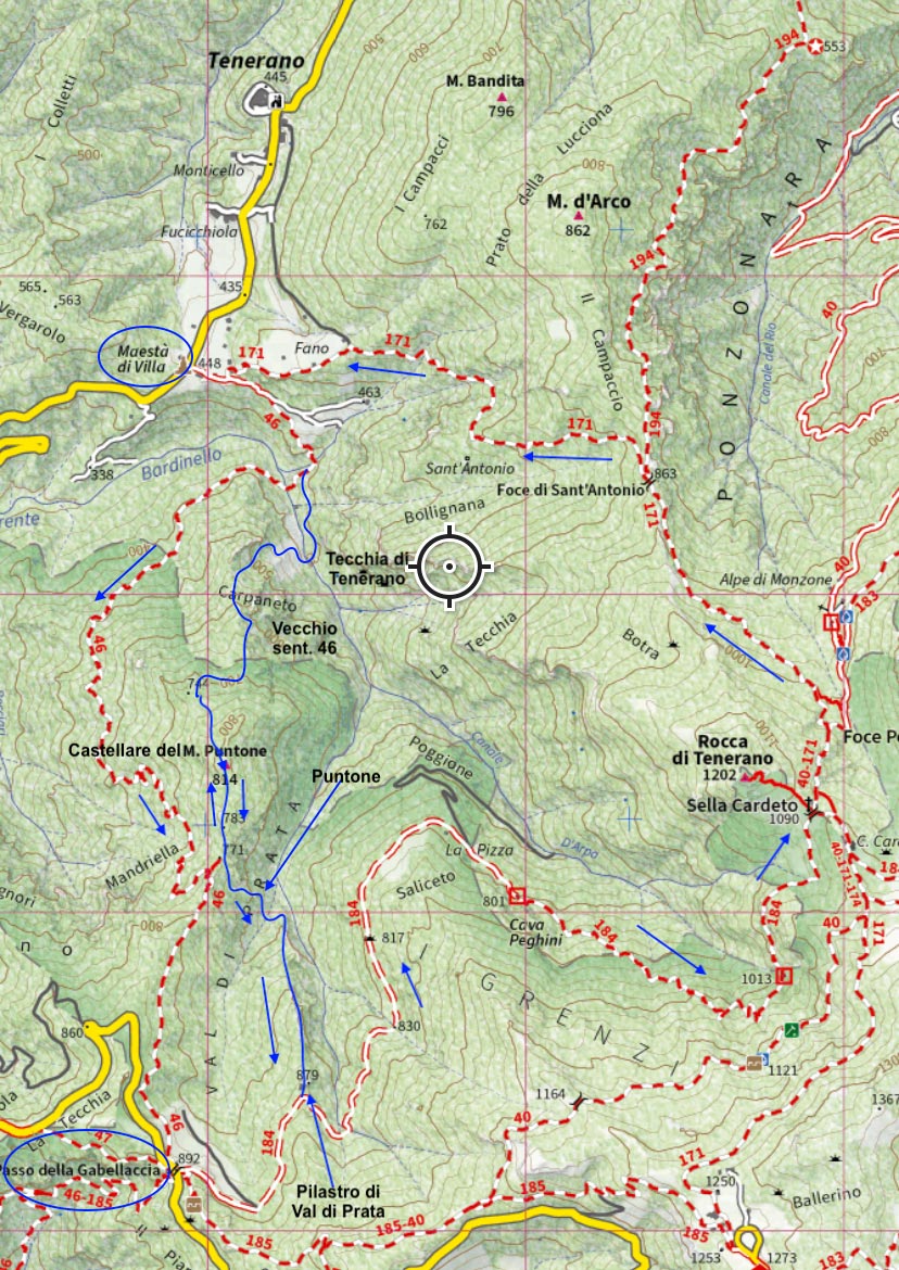 Se all’inizio della gita, al già detto bivio segnalato per la vicina Tecchia di Tenerano, si volesse farvi una digressione – senz’altro consigliabile -, prima di raggiungerla e più esattamente appena prima di un cartello metallico che indirizza verso destra al rudere di Casteglia, sullo stesso lato (destra) si nota su una roccia una segnalazione bianco rossa con la scritta ’46’: da qui inizia un riconoscibile sentiero che evidentemente è un vecchio e dismesso tracciato del sentiero CAI che fino a poco fa portava quel numero, ora sostituito da 197. Tale sentiero risale, in sinistra idrografica della Val Saliceto, le pendici della dorsale del Castellare sul lato opposto (E) rispetto a quello (O) su cui si svolge il 197. Raggiunto il filo della dorsale e risalitolo per un po’, esso traversa poi a destra sull’altro versante (O) percorrendolo ben più in alto del 197, passa appena a monte della quota 744.0 m CTR e infine sale alla vetta del Castellare del Puntone, da ultimo transitando in quel corridoio sommitale a cui si è accennato sopra. Dal Castellare, poi, esso coincide con il sentiero che scende a Mandriella, lascia a sinistra il tracciato per il Puntone e infine si congiunge al 197 poco prima che esso valichi la dorsale per avviarsi alla Gabellaccia.