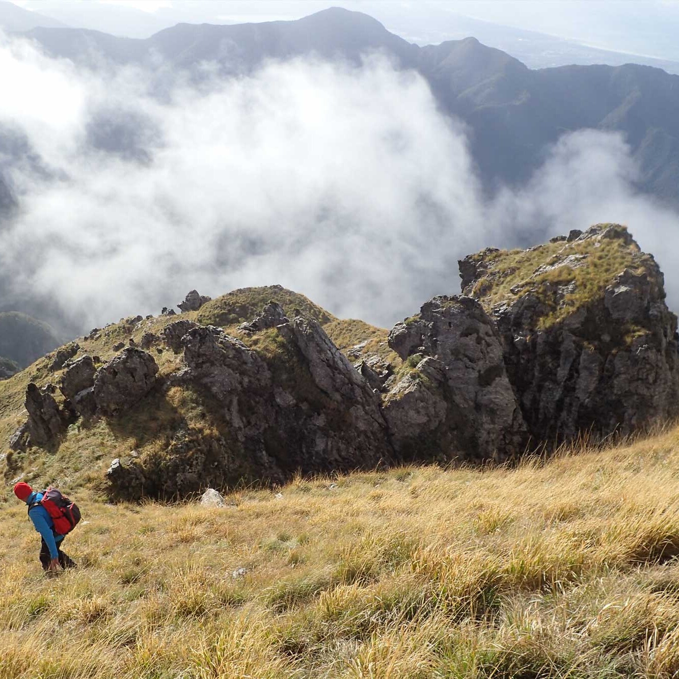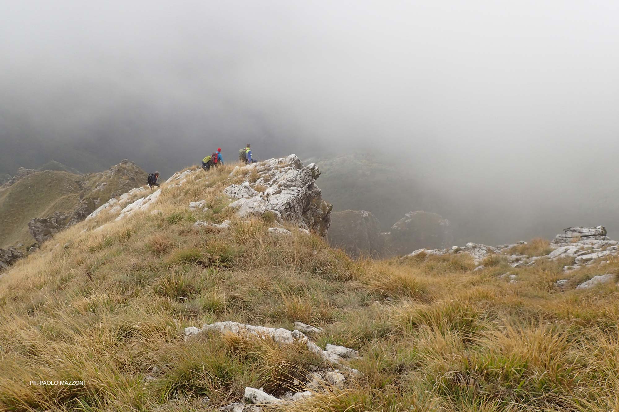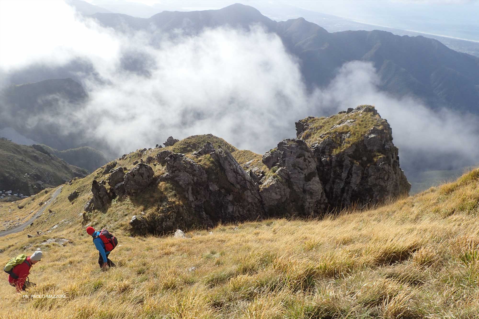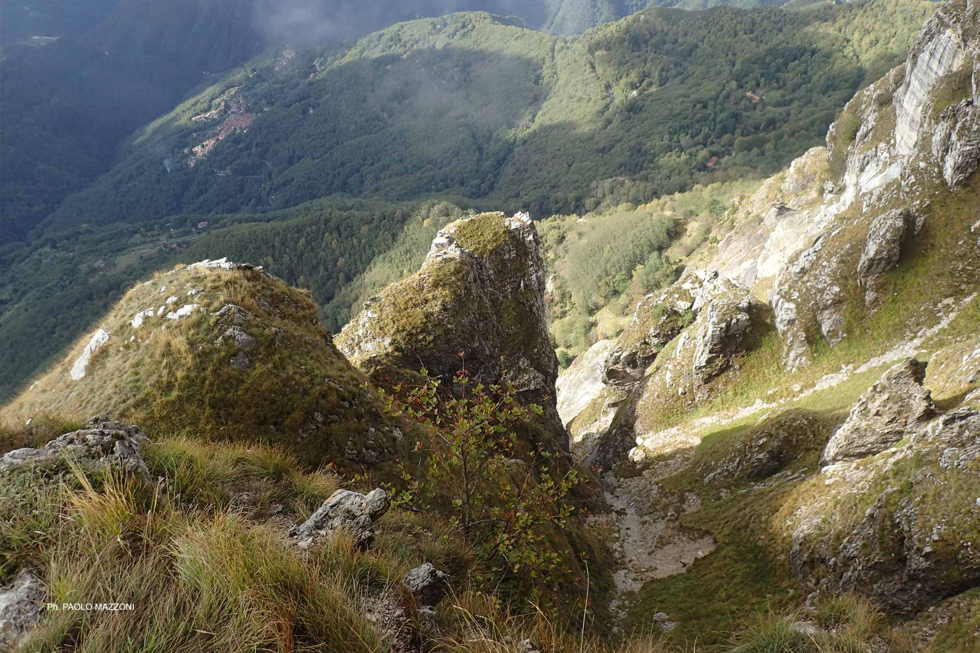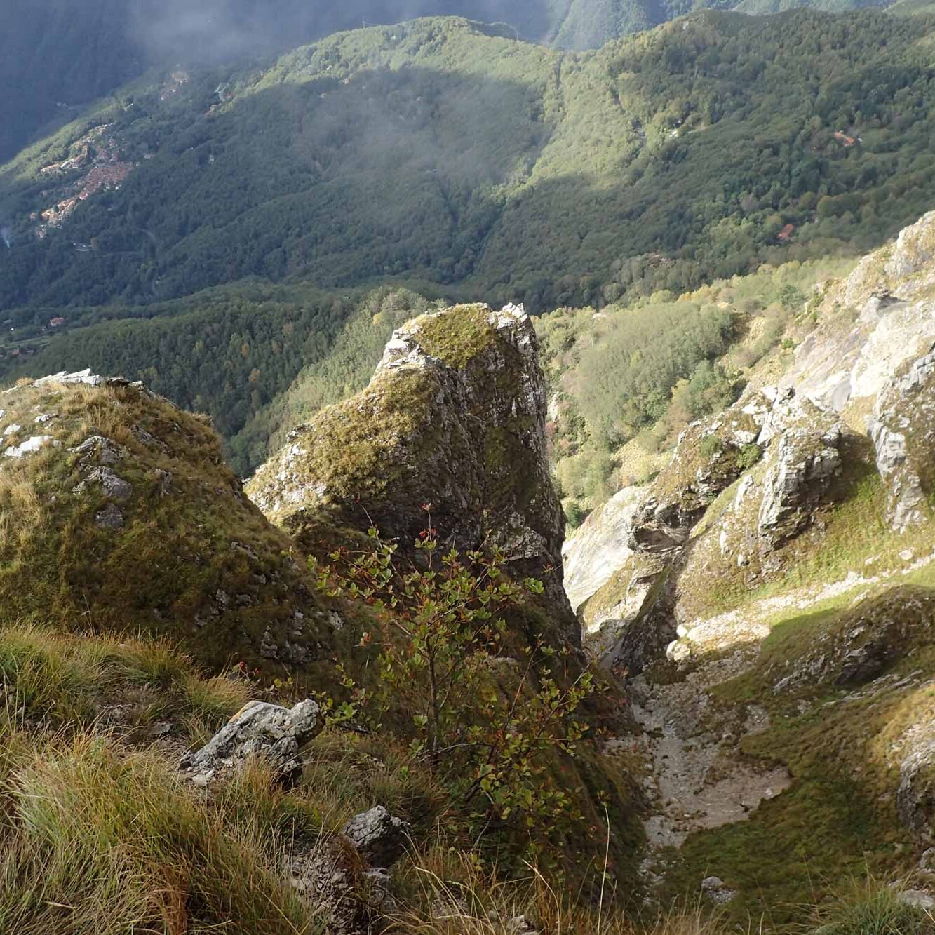 Si sale dunque agevolmente, tra erba e rocce, la vaga ma bella dorsale appena incrociata; a sinistra difficili e ripidissimi pendii si stendono fino al bordo del canale SO; si può constatare, anche da questo punto d’osservazione, che la q. 1419.2 m è inaccessibile all’escursionista da ogni lato. Si raggiunge infine la q. 1487.9 m, con una salita finale breve e facile ma non elementare; la cima è stretta, esposta e molto panoramica. Scesi di là, con qualche andirivieni, all’”alto colletto erboso” delle fonti, si continua per la massima pendenza su un pendio ormai informe fino a intercettare il sentiero che sale dal canale del Pirosetto (1565 m c.).