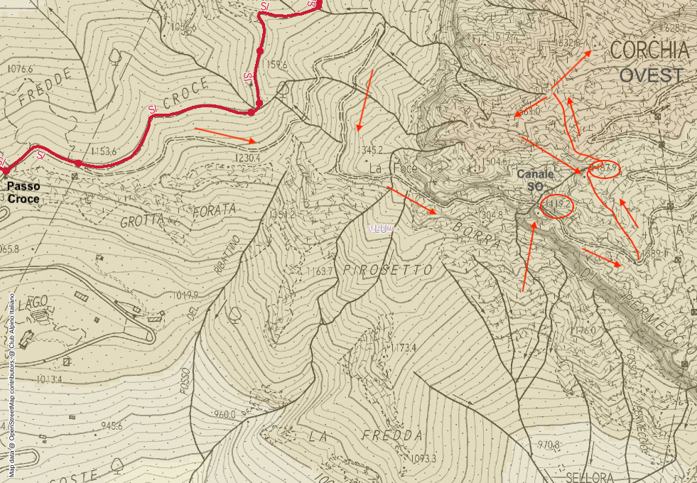 La ricostruzione fatta presenta un problema: la guida del 1958 attribuisce difficoltà di II- al canale Sudovest; ma, all’ingresso della galleria sotto la q. 1419.2 m, attualmente esso mostra difficoltà senz’altro maggiori in corrispondenza di alcuni grandi massi che lo sbarrano pochi metri sopra la marmifera.